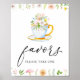 Panneau de faveurs avec une illustration de fleurs sauvages, de verdure et de tasse à thé avec le mot "faveurs" dans un script de calligraphie amusant.