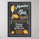 Panneau d'affiche de bar à mimosa sur tableau noir pour votre prochaine fête. Caractéristiques d'un grand mimosa avec des oranges fraîches et des polices amusantes. Tous les textes peuvent être modifiés sous le mot "menu".