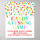Candy devinez le poster de jeu pour le baby shower en motif de confetti arc-en-ciel, parfait pour un bébé saupoudré.