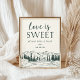 Les clients Invitations pourront déguster des bonbons avec notre charmante enseigne de table à dessert mariage rustique. 11x14 panneau de table dessert dispose d'une bordure inférieure de sommets dessinés à la main, de pins et d'une rivière qui coule, avec "l'amour est doux, s'il vous plaît prenez un plaisir" en haut. Personnalisez avec votre date de mariage sous l'inscription, et montez et présentez à votre bar de dessert mariage !