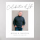 Ce panneau photo commémoratif moderne présente un fond blanc classique, une seule photo verticale et une typographie simple mais élégante. Le texte sur le devant dit "Célébration de la vie". Cette conception est coordonnée avec d'autres articles commémoratifs de notre magasin tels que les cartes de remerciement et les cartes de souvenir.