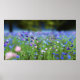 Un champ de fleurs de maïs dans les tons bleu profond et pâle, violet, lavande et rose, avec des feuilles vert pâle.