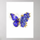Bijoux, bleu, saphir, papillon aux fleurs pétillantes avec aile décorée de bleu, fleurs précieuses avec feuilles d'or sur arrière - plan blanc.