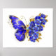 Bijoux, bleu, saphir, papillon aux fleurs pétillantes avec aile décorée de bleu, fleurs précieuses avec feuilles d'or sur arrière - plan blanc.
