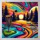Un terrain de golf à disques coloré avec un panier de golf à disques, une pleine lune et des disques volants au coucher du soleil dans les bois. Rose, bleu, orange coloré art de l'air.