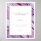 Cet ensemble de design mariage, avec son motif abstrait d'ondulations fluides et de veines de prune scintillante, rappelle les formations rocheuses et les gemmes étincelantes. La palette de couleurs frappante dans les teintes allant du lilas et de la lavande à la perwinkle molle ajoute à l'attrait. L'affiche "Bienvenue" montrée ici a la limite ci-dessus d'un arrière - plan blanc avec un modèle pour ajouter facilement un message de bienvenue, vos noms et la date du mariage. Recherchez ID903 pour voir d'autres choix de couleurs et coordonner des pièces pour cette collection de mariages unique.