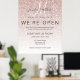 Parties scintillant d'or Rose "We're Open" maquillage et salon de coiffure COVID Faire-part. Salon réouverture design avec parties scintillant rose rose rose rose vif, arrière - plan blanc et un logo monogramme design modèle que vous pouvez customiser. ©Elke Clarke. Personnalisez ce design personnalisé avec votre propre texte et vos détails professionnels. A le texte standard pour dire à vos clients que votre entreprise est sécuritaire à visiter. "Avec les nouvelles mesures de sécurité COVID19 en place pour garder nos clients et nos employés en sécurité."