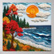 Une représentation pittoresque d'un littoral aux arbres colorés, aux vagues ondulées de l'océan et à un coucher de soleil radieux, artistiquement élaboré à l'aide de techniques de recouvrement complexes.