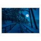 Paysage d'hiver avec pins et sapins enneigés au clair de lune à nuit étoilée avec pleine lune. Vue sur la forêt de conifères avec chemin en bois près de la côte de la mer avec un beau ciel nocturne avec étoiles