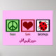 Joli poster de coccinelle rose avec un signe de paix, le coeur, et un mignon pois rouge et noir. Customisez cette impression avec votre nom ou autre texte dans magenta.