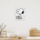 Cette oeuvre Peanuts présente Snoopy assise sur l'arrière - plan de bandes dessinées Charles M. Schulz en noir et blanc.