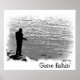 Éloignons-nous de tout ça et allons pêcher ! Customisez ou retirez facilement le texte de cette affiche qui présente l'image en noir et blanc d'un pêcheur solitaire debout sur une corniche rocheuse au lac Seneca à Genève, New York. Le texte dit : "On a pêché"