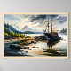 Plongez dans une scène tranquille avec une peinture captivante de bateau. Cette oeuvre d'art capture magnifiquement un bateau de pêche, doucement appuyé sur des rochers robustes au milieu d'une rivière sereine. La toile de fond est composée de montagnes enneigées et d'une majestueuse pinède, créant un paysage naturel à couper le souffle. Peinture d'art pour votre décor maison. Vous pouvez acheter avec cadre et papier d'art. Taille de l'image du fichier original 40'x27' pouces (300 ppp).