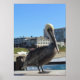 Pelican se tient calmement sur la jetée. La plage et le surf sont en toile de fond, ainsi que les tours. Un ciel d'hiver bleu brillant finit la scène.