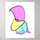 Un pingouin magique pastel avec un corps bleu clair et blanc, des pieds lavande, un bec jaune clair et de minuscules yeux noirs, portant une cape et un capuchon de lavande design avec un bijou bleu ciel clair en forme de goutte d'eau à la fin, portant une baguette lavande et jaune clair étoile magique.