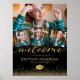 Poster de bienvenue personnalisé 2023 avec un arrière - plan noir élégant qui peut être changé en n'importe quelle couleur, 4 photos de la diplômée, élégante parties scintillant faux or, un mortier, et un modèle de bienvenue simple qui est facile à personnaliser.