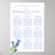 Plan de sièges mariage fleuri Campanula en bleu, vert et blanc. Peinture fleur sauvage sur un arrière - plan blanc. Modifiez ce tableau de table mariage avec vos propres sièges et les noms des invités. Parfait pour ceux qui aiment la simplicité et le romantisme. Idéal pour les mariages d'église, de style champêtre, de jardin et de registre simple. Design et aquarelle d'art de Sarah Trett.