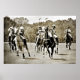 Cette superbe photo d'action sportive est de Drake Photography et présente l'image d'un troupeau de poneys de polo dans une allumette de polo. Les joueurs ont leurs maillets levés et prêts à frapper la balle alors qu'ils galopent dans le terrain herbeux. Un grand cadeau pour tous les amateurs de pur-sang ou de quart cheval équestre ou de cheval qui aiment jouer au polo. Cherchez dans mon magasin les produits correspondants !