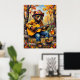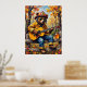 Ce magnifique tableau représente un ours habillé comme pompier, portant des lunettes de soleil et un casque, montant une guitare acoustique sur une clôture en bois patinée. L'arrière - plan est une forêt automnale dynamique avec des arbres dans le feuillage d'automne complet et des feuilles épars sur le sol. Un pot de miel doré est placé à côté sur un poteau de clôture. Les coups de pinceau épais et texturés rehaussent la nature capricieuse et douce de la scène, avec "Love My Honey" en évidence.