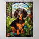 Portrait noir et tan dachshund mignon dans une fenêtre en verre floral