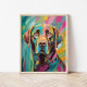 Portrait d'art moderne et ludique d'un laboratoire de chocolat peint avec des couleurs vives, turquoises, jaunes, roses et vertes. La palette vibrante et les coups de pinceau expressifs donnent au chien une apparence énergique et joyeuse, apportant une touche amusante et imaginative aux portraits traditionnels d'animaux de compagnie. Cette pièce vivante et colorée capture la personnalité du chien dans un style audacieux et contemporain, parfait pour ajouter une touche joyeuse à tout espace.
