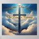 Croix bleue parmi des nuages moelleux avec design typographique doré.