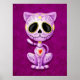 This adorable purple kitten design is decorated with swirls and dot patterns. Yellow flower pedals circle the pure black eyes in the tradition of the Day of the Dead sugar skulls. The cat is sitting down, looking forward with its tail waving in the background. The over sized head sits on a tiny body which creates a playful, cartoon like appearance. A five point star sits in the middle of the kitten's forehead while a bright red and yellow heart appears in the center of the chest. This cute little cat is a fun and stylish design inspire by the beautiful patterns of the Dead sugar skulls (Jour de la Mort.