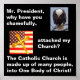Deux photos sont sur cette affiche. L'un est un aigle à tête blanche américain et l'autre est un Crucifix catholique antique au-dessus du drapeau américain. L'affiche a un arrière - plan noir et ces mots en blanc, "Monsieur le Président, pourquoi avez-vous impitoyablement, honteusement attaqué ma Foi et mon Église ?" "L'Église catholique est composée de beaucoup de gens, en Un Corps du Christ !"