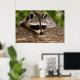 Une affiche avec la photo d'un joli et curieux raton laveur reposant son visage sur une rondelle de bois. Adorable.