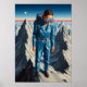 Peinture à l'huile Art Déco stylisée représentant une femme en costume bleu cérulean dans un moment de contemplation sur une crête de montagne, rendue avec une précision polie, sculpturale et un éclairage aérien spectaculaire dans une perspective en grand angle.