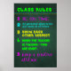 Texte coloré sur l'arrière - plan de tableau noir vert dit : Règles de classe _________________ 1. Soyez à l'heure 2. Tous les appareils électroniques personnels rangent en tout temps 3. Montrez-vous le respect de l'autre 4. Quand le professeur parle - vous êtes calme 5. Gardez une attitude positive Parfait pour l'enseignant dans votre vie!