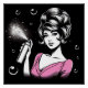 Une femme élégante, à la mode du milieu du 20ème siècle, tient une boîte de spray de cheveux à la main droite. Ses cheveux volumineux, méticuleusement stylisés, se distinguent par leur arrière - plan noir. Des bulles géantes flottent autour d'elle, ajoutant à l'atmosphère ludique mais sophistiquée. Cette oeuvre est un hommage au glamour emblématique d'une époque révolue.