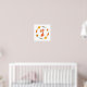 L'imprimé de pépinière adorable présente un doux vecteur illustration d'un renard rouge bébé à l'intérieur d'une couronne ronde en feuille dans de belles teintes d'automne jaune, orange et bleu.