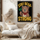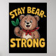 Cette illustration encourageante présente un ours joyeux tenant une petite branche avec des feuilles verts. L'ours porte un bandana rouge, ajoutant une touche de charme à son apparence. Le texte "Stay Bear-Strong" entoure l'ours, créant un thème encourageant et motivant. Le design dynamique capte un sentiment de résilience et de positivité, parfait pour transmettre un message de force et de persévérance.