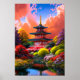 Découvrez une tranche de paradis, une grande pagode japonaise se dresse au milieu d'une flore époustouflante. Le ciel au-dessus est orné de nuages roses, dans une ambiance sereine et rêveuse. Perdez-vous dans ce havre de beauté, où la pagode et la nature s'harmonisent en toute élégance.
