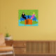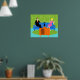 Ce Retro Couple with Cat Poster propose un couple de dessins animés qui essaie de se sentir à l'aise tout en regardant la télévision sur un canapé bleu moderne du milieu du siècle. Le chat, cependant, a d'autres idées. D'un côté du canapé, un beau homme en costume noir avec cravate rouge. De l'autre côté du canapé design, il y a une belle femme blonde en forme de robe rose chaude. Les choses se passeraient bien si ce n'était le chat noir élégant, qui a revendiqué le coussin du canapé central. Ce design minimaliste de style années 60 est installé dans un élégant salon. La toile de fond du canapé est un mur vert en pierre. Au niveau de l'aqua se trouve un tapis rond et vert en forme de marais qui s'accorde avec le mur en pierre. A l'avant-garde du design, on voit l'arrière d'une télévision orange avec des oreilles de lapin, qui semble jouer le programme TV préféré du chat.