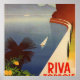 Affiche de voyage montrant la vue d'un bateau sur le lac de Garde, avec un citronnier coloré, et les montagnes au loin.