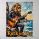 Cette oeuvre d'art vibrante comprend un lion cool, des lunettes de soleil sportives et une veste en cuir, jouant intensément une guitare électrique au sommet d'une roche surplombant un océan dynamique et rempli de vagues. Un coucher de soleil enflammé illumine le ciel et la côte lointaine. Les coups de pinceau épais et texturés de la peinture donnent un aspect brut et énergique à la scène, avec "Rock or Die" audacieusement affiché ci-dessous, incarnant un esprit rebelle.