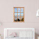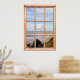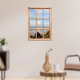 L'océan doux dans cette scène de fenêtre apaisante se courbe pour rencontrer une plage de sable doré doux. Au premier plan, il y a des rochers et de l'herbe, et le ciel au-dessus est bleu avec des cumulus blancs et des nuages de stratus. Il s'agit d'une vue mer très calme, encadrée par une fenêtre en bois chaleureux, qui crée une fausse vue convaincante sur n'importe quel mur de votre maison.