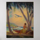 C'est un tableau de l'artiste américain Ruehl Frederick Heckman en 1939. Il montre une femme hawaïenne, bien sûr, dans un bateau et au-dessus se trouve un avion. Il y a des palmiers et il a l'air très calme.