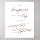 Cette affiche élégante de calligraphie rose gold sur le thème de la gueule de bois et des souvenirs est parfaite pour un mariage simple. Le panneau indique "la gueule de bois ne dure qu'un jour mais les souvenirs durent toute une vie". Le design rose pâle présente une affiche minimaliste décorée d'une typographie romantique et fantaisiste en faux feuilletage rose or.