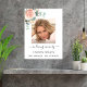Personnalisez et ajoutez une photo, un nom et des dates. Un arrière - plan blanc, décoré d'or rose et de rose rose rose, de fleurs et d'eucalyptus.
