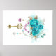 Clé d'or antique aux roses turquoise tendance décorée de feuilles d'or blanc et de perles rose et bleu. Couleur tendance. Rose turquoise. Blanc doré. Tiffany bleu.