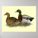 Les rouens sont de gros canards avec un motif de couleur semblable à Mallards. La tête verte brillante du drake se distingue mais les plumes crayonnées de la poule sont magnifiquement modelées.