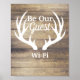 Affiche rustique de style ferme "Be Our Guest" avec planches en bois arrière - plan et bois de cerfs blancs. Frame et écrivez votre mot de passe WiFi sur le verre avec un marqueur d'effacement sec!