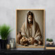 Jésus est assis à une table plate, vêtu d'une robe blanche qui coule et d'un modeste couvre-tête, rayonnant calme et compassion. Ses mains brisent un morceau de pain, un acte qui signifie la Dernière Cène, pierre angulaire de la théologie chrétienne symbolisant la foi, le sacrifice et l'amour divin. Sur la table sont des éléments simples mais significatifs : deux vaisseaux en argile, l'un représentant la cuve de vin de l'alliance, et l'autre renforçant la modestie de la scène. Un panier tissé, rempli de pains, symbolise l’abondante disposition et bénédictions de Dieu. L’expression sereine sur le visage de Jésus reflète une solennité spirituelle profonde, attirant le spectateur dans ce moment intime et sacré. Le cadre sobre met l'accent sur l'humilité, encourageant la réflexion sur le spirituel sur le matériel. Cette représentation émouvante capture le coeur des enseignements de Jésus, offrant un moment de contemplation sur Son sacrifice et l’unité qu’Il inspire. Il sert de rappel visuel de l'amour et de la dévotion incarnés dans l'Eucharistie, inspirant une foi plus profonde et un sentiment de paix pour tous ceux qui réfléchissent à cet acte de grâce puissant et intemporel.