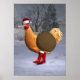 le père noël a reçu une poule mignonne comme aide cette année - joyeusement en marchant avec des bottes rouges et casquette à travers la neige en hiver