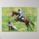 Un tableau numérique d'un cheval d'événement et d'un cavalier sautant une clôture à un événement d'une journée, fait à partir d'une photo.