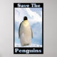 Un pingouin solitaire se dresse devant une montagne de neige avec les mots Save The Penguins qui l'entourent.