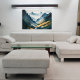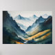 Cette affiche horizontale captivante présente une scène montagneuse époustouflante, magistralement rendue dans des tons bleus et bronzés apaisants qui évoquent un sentiment de sérénité et d'émerveillement. Au coeur de la composition, un ruisseau cristallin serpente gracieusement le long de la montagne, ses eaux reflétant la teinte azurée du ciel, créant un mélange harmonieux de couleurs qui respire la tranquillité. Les montagnes, dépeintes dans des tons différents de bronze, s'élèvent majestueusement sur le fond, leurs pics touchant le ciel, suggérant à la fois leur grandeur et la beauté intemporelle de la nature.